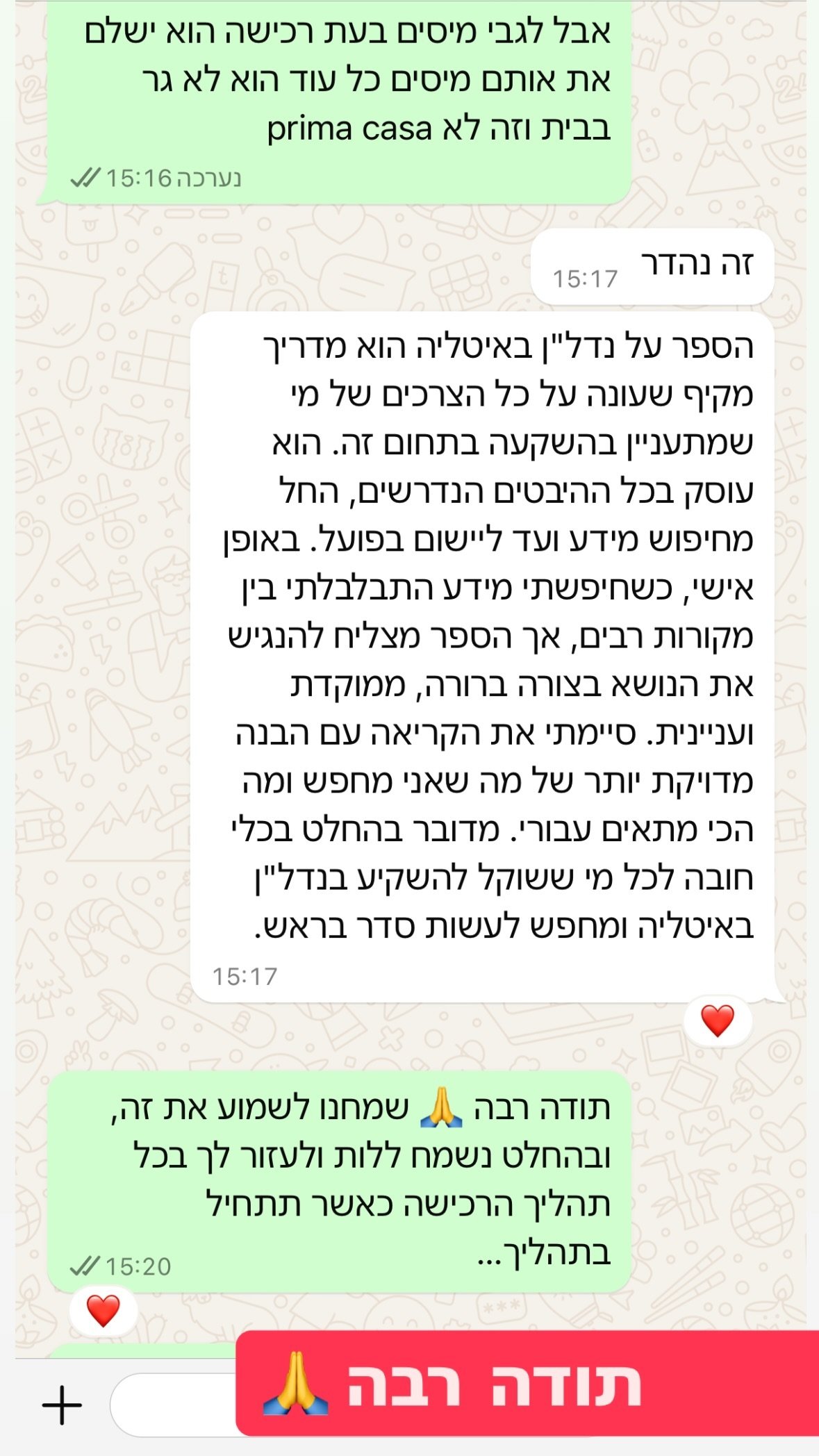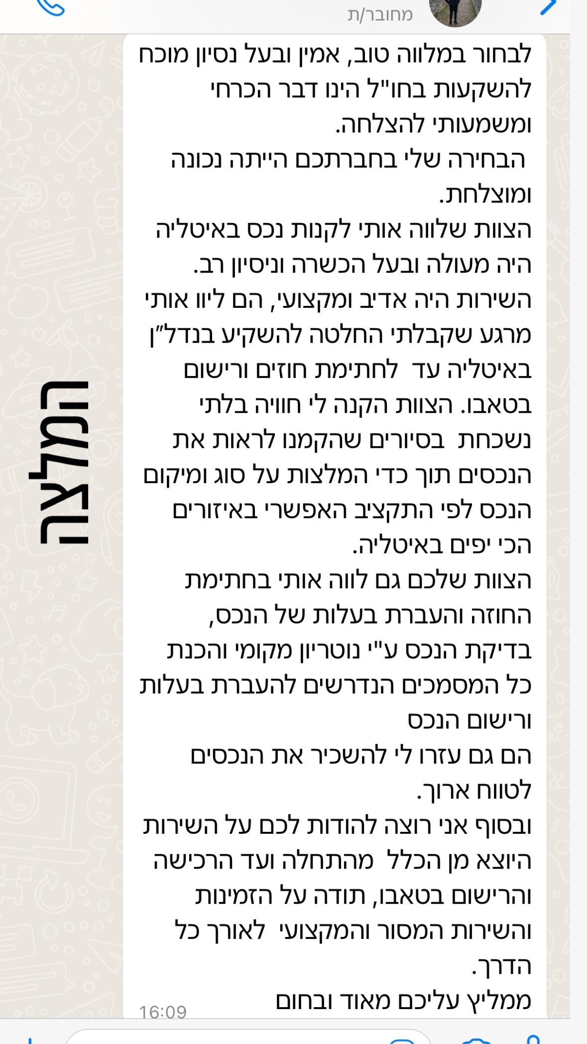 פגישת הייעוץ מתאימה לכל מי שחולם לרכוש נכס בצפון איטליה – בין אם זה להשקעה, לנופש או למגורים, ורוצה להתחיל את התהליך בצורה נכונה, חכמה ובטוחה.